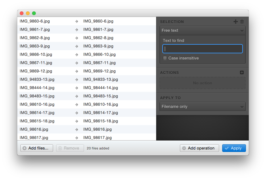 Selection of text and actions can be chained, so it is up to you to add and configure them the way you want, to create tailor-made new names for your files.